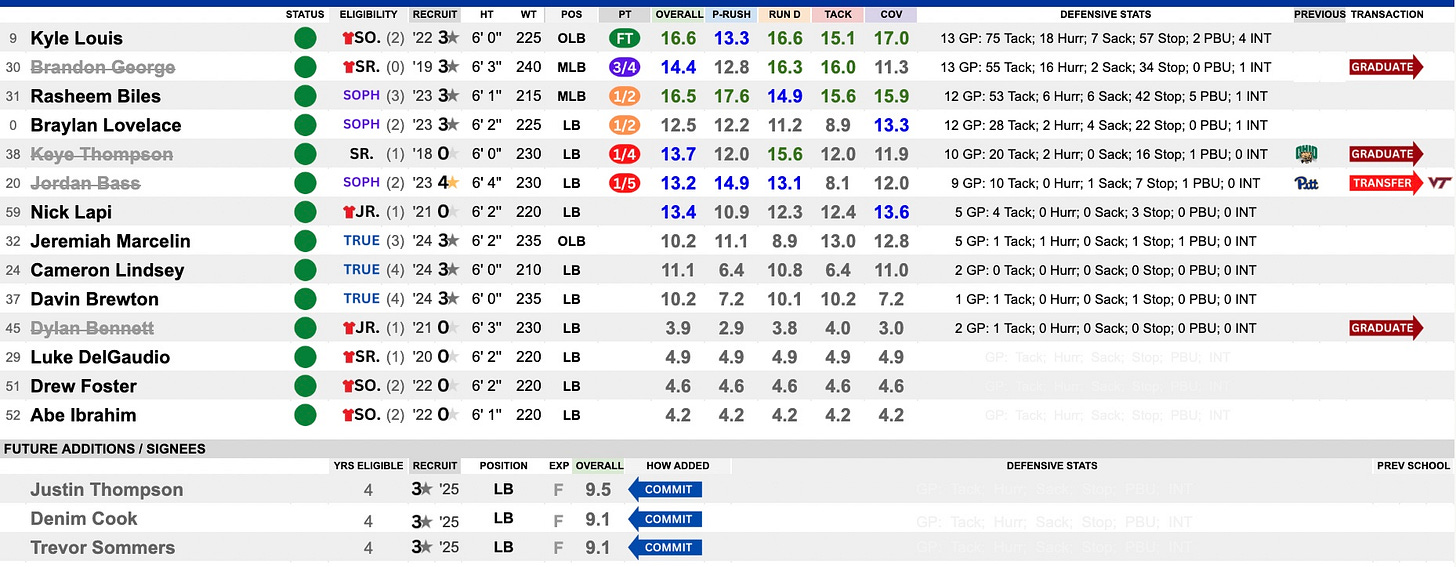 A good amount of the stellar pass rush and work in the backfield came from this group, led by Kyle Louis. His return and true sophomore Rasheem Biles sets this up for a repeat performance. The loss of Brandon George can be overcome, but they know what they have here and don’t do much in the portal for that very reason. They are set up to continue their havoc-wreaking in 2025.