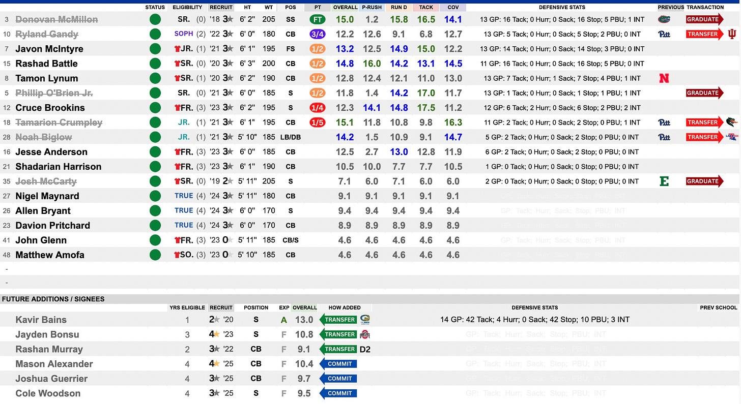 This group was challenged quite a bit as game scripts often forced ‘shootout’ type games. The final numbers didn’t look great but weren’t as bad as the surface numbers. Donovan McMillon (former Florida) was their leader at SS. His graduation will challenge somebody to step up in that vital role. They have some options, including UC-Davis transfer Kavir Bains and Ohio State transfer Jayden Bonsu. Some work to do here to get this group propped up, but the seeds are there.