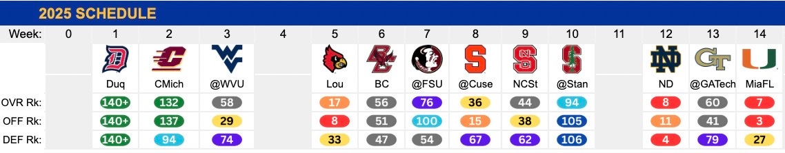 SOS+ has this as a bit more difficult of a slate. Adding Notre Dame will do that to you. They get the Irish in week 12 in Pittsburgh. Their other non-conference tilts start with two winnable games with Duquesne and Central Michigan at home to kickoff the season. They should get that 2-0 start and roll into Morgantown for the ‘Backyard Brawl,’ hoping for back-to-back wins that rivalry for the first time since 07-08. Then, the typical tough but not overwhelming ACC slate will feature a lot of toss-ups, and if they can steal a couple and get the bounces going their way, it could be that growth season they need to get back to their expectation level.