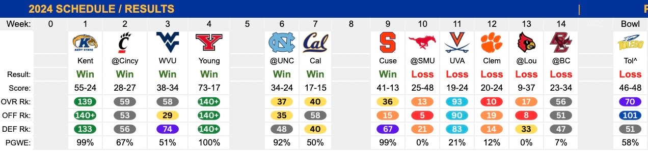 A tale of two seasons here. They got off to a 7-0 start with some impressive wins, including two non-conference games against Big 12 schools — at Cincinnati and West Virginia — in weeks two and three. They won on the road in Chapel Hill and handled a scare from Cal in week seven after they traveled cross country. Perhaps their most impressive win was the 41-13 beat down of a very good Syracuse team. After that week nine game, things just went south in a hurry and they lost their last five games. They weren’t very competitive in those games and then they dropped the bowl game to Toledo to finish on a six-game losing streak.