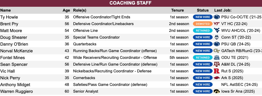 Entering the 2025 season, expectations were high, but quickly gave way to a historic collapse that fundamentally reshaped the program. The Hokies opened with an 0-3 start, punctuated by a lopsided 45-26 home loss to Old Dominion, leading to Pry’s dismissal on September 14, 2025. In a major shift, Virginia Tech hired former Penn State coach James Franklin in November to lead the program into 2026 and beyond. Remarkably, Franklin rehired Pry as his defensive coordinator for the 2026 season, reuniting the long-time colleagues in a bid to finally return Blacksburg to the national prominence of the Beamer era.