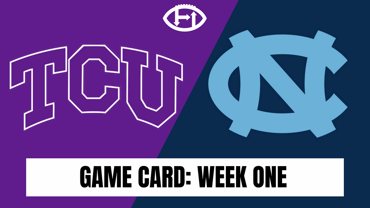 Don’t forget our extended week one does include more tantalizing storyline in and of itself. Bill Belichick makes his collegiate debut this evening, as his Tar Heels take on TCU. And, we have a ‘Game Card’ for you: